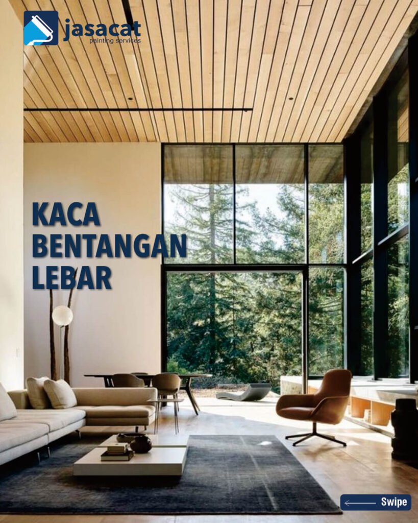 Dengan bentangan lebar kaca ini dimungkinkan dengan pemakaian kusen berbahan aluminium. Pemakaian kusen aluminium akan menaikkan kesan ringan yang jadi elemen utama dari tampilan rumah minimalis.
