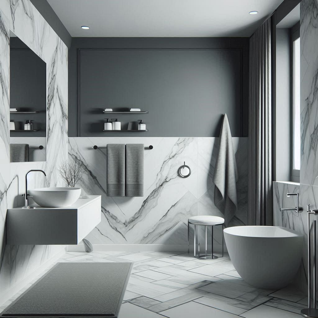 Warna monokrom sangat cocok untuk kamar mandi karena memberikan kesan bersih dan rapi. Kombinasi putih dan hitam dengan detail marmer akan menghadirkan nuansa mewah yang tak lekang oleh waktu. Jika ingin suasana yang lebih lembut, gunakan warna abu-abu muda dengan sentuhan silver pada aksesoris kamar mandi seperti keran dan gantungan handuk.