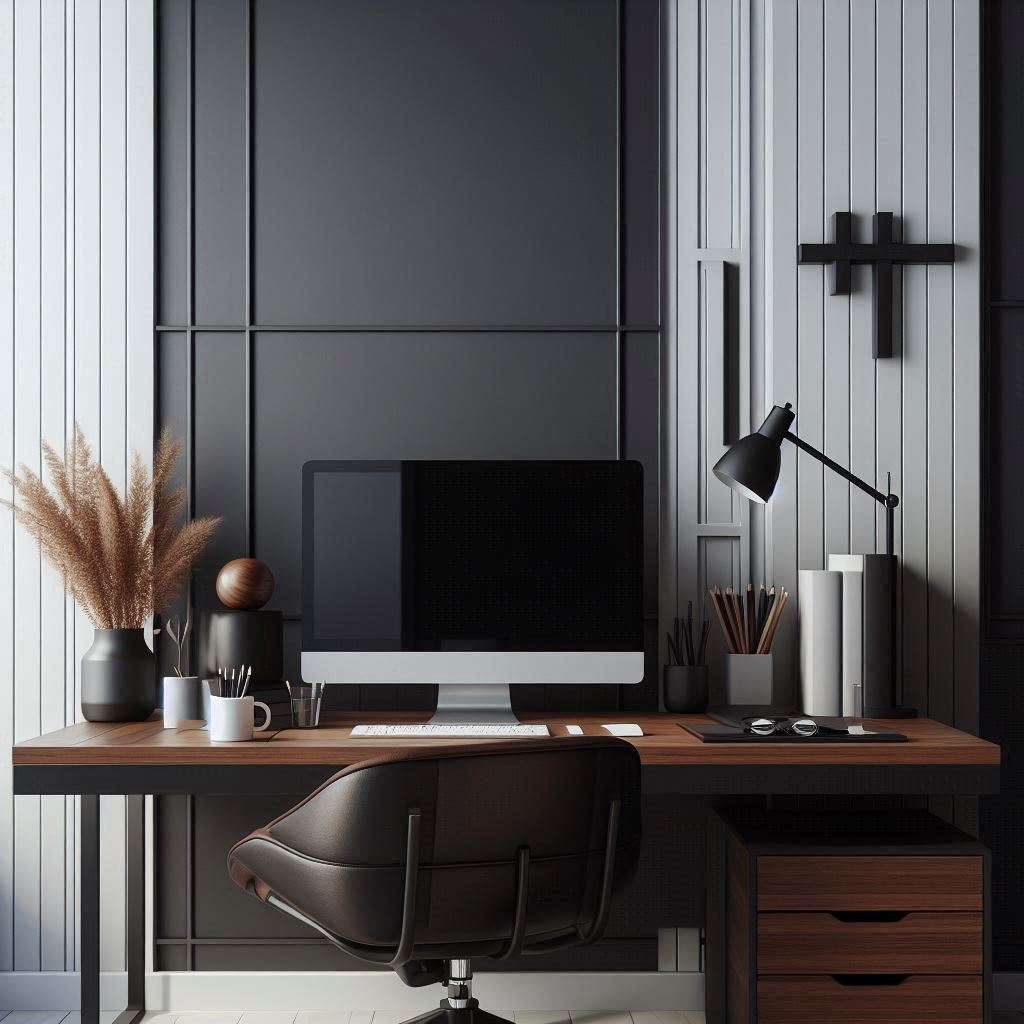 Untuk menciptakan ruang kerja yang mendukung produktivitas, warna monokrom adalah pilihan tepat. Gunakan kombinasi hitam, abu-abu, dan putih untuk tampilan yang profesional dan elegan. Jika ingin sedikit sentuhan yang lebih kreatif, coba tambahkan elemen kayu berwarna cokelat tua agar ruang kerja tetap terasa hangat dan nyaman.