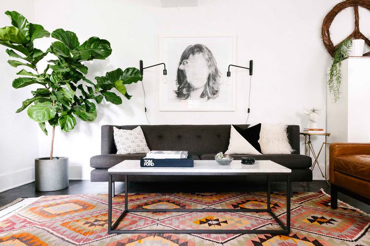 Hampir mirip dengan ruang tamu sebelumnya, ide dekorasi kali ini juga memanfaatkan tanaman hijau. Namun, tidak berhenti di situ, dekorasi ruang tamu sederhana tapi menarik ini memiliki karpet yang terkesan hippie. Penambahan dekorasi logo perdamaian di bagian atas juga akan menambah keunikannya.