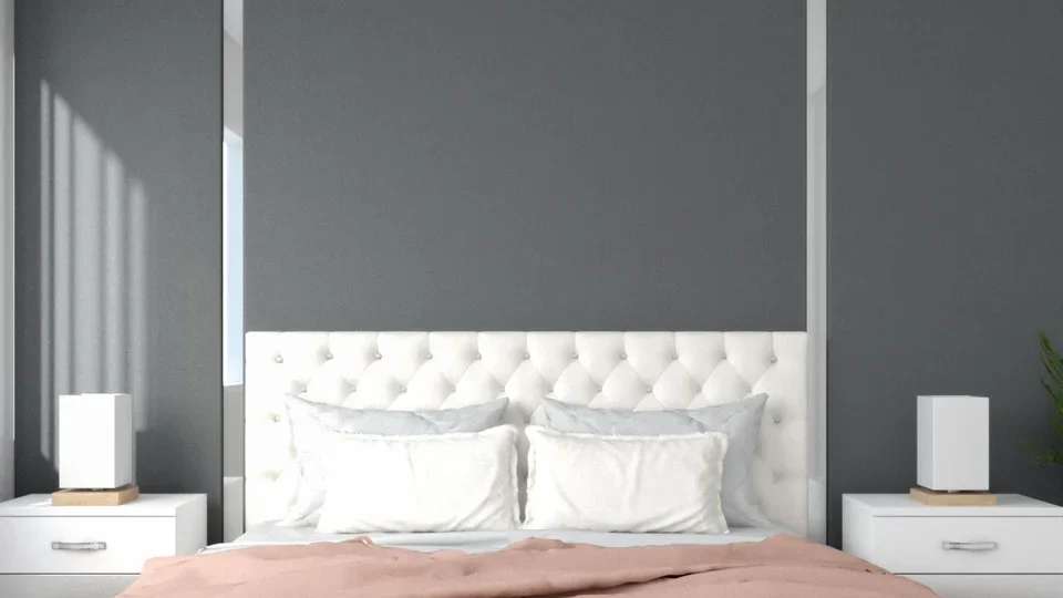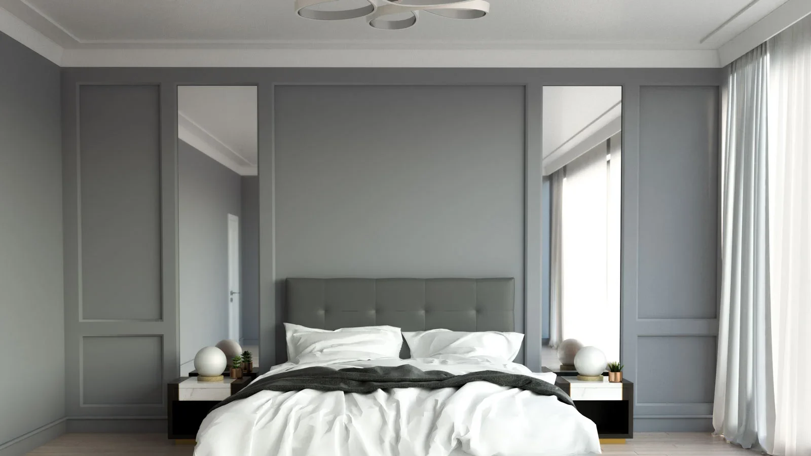 Panel dinding abu-abu gelap yang dilengkapi dengan cermin bisa menjadi elemen dekoratif yang menarik dalam kamar tidur. Ini akan menciptakan efek visual yang unik dan memperluas ruangan.