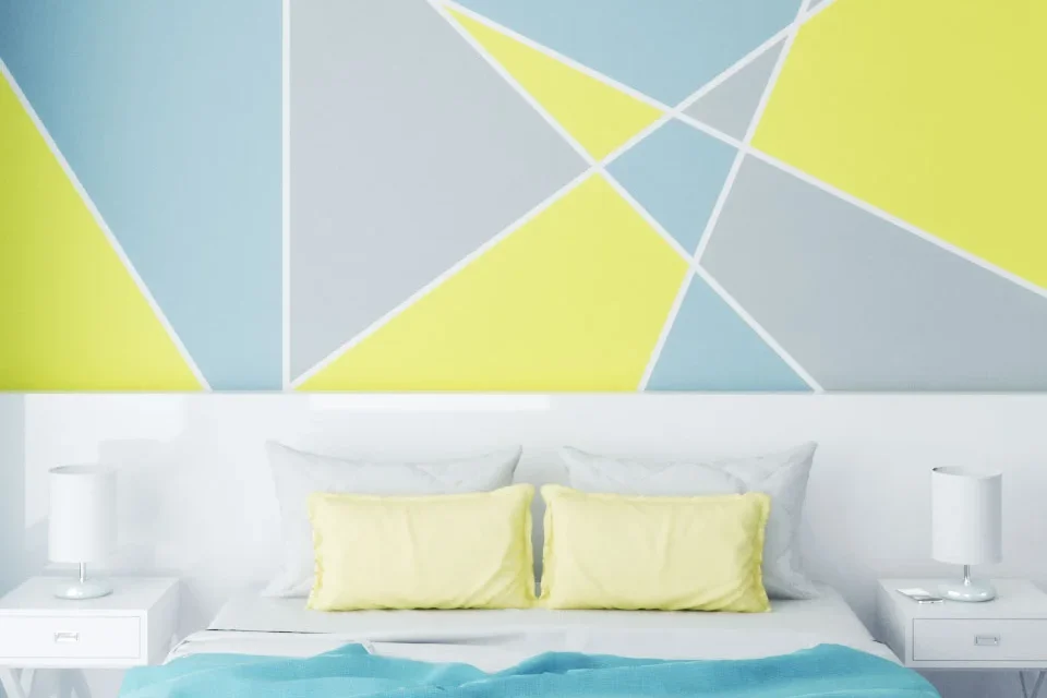 Warna-warna cerah seperti kuning dan biru dapat memberikan kesan yang menyenangkan dan energik pada ruangan. Pengecatan dinding dengan pola geometris yang menggunakan kombinasi warna ini akan memberikan tampilan yang ceria dan mengundang.