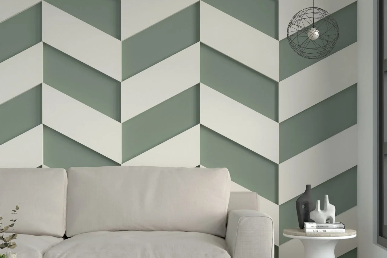 Warna-warna seperti sage dan krem memberikan kesan yang hangat dan alami pada ruangan. Pengecatan dinding dengan pola geometris dalam kombinasi warna ini akan menciptakan tampilan yang kreatif dan modern.