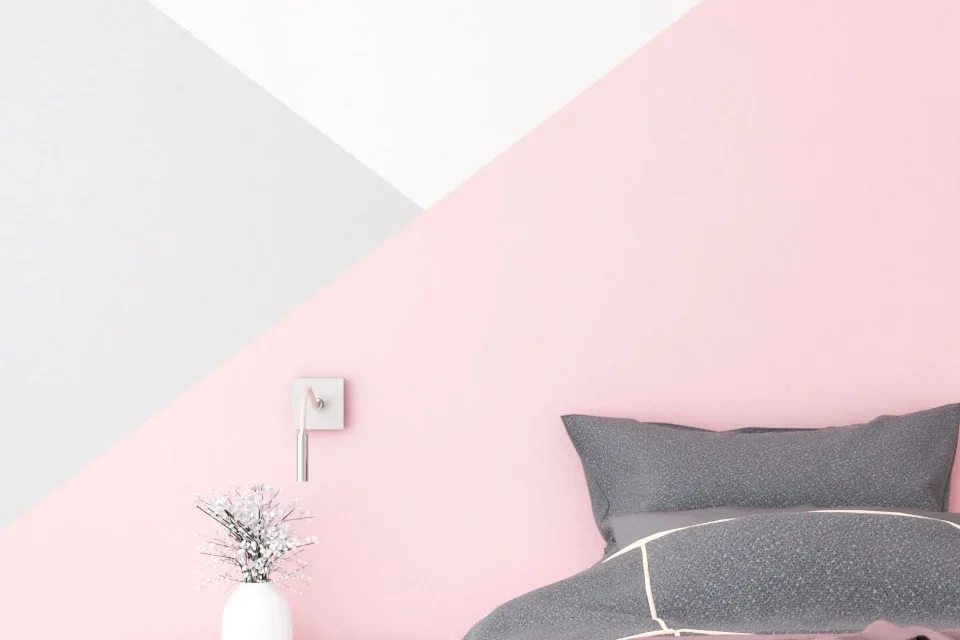 Kombinasi merah muda dan abu-abu memberikan kesan yang manis dan elegan pada ruangan. Pengecatan dinding dengan pola geometris dalam warna-warna ini akan menciptakan tampilan yang indah dan feminin.