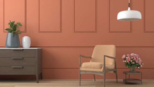 Cat tembok dan wall moulding berwarna peach menjadi pilihan tepat untuk memberikan kesan elegan dan menenangkan pada ruangan Anda. Seperti gambar di atas, ruangan terkesan lebih kekinian tanpa membuatnya terlihat norak.