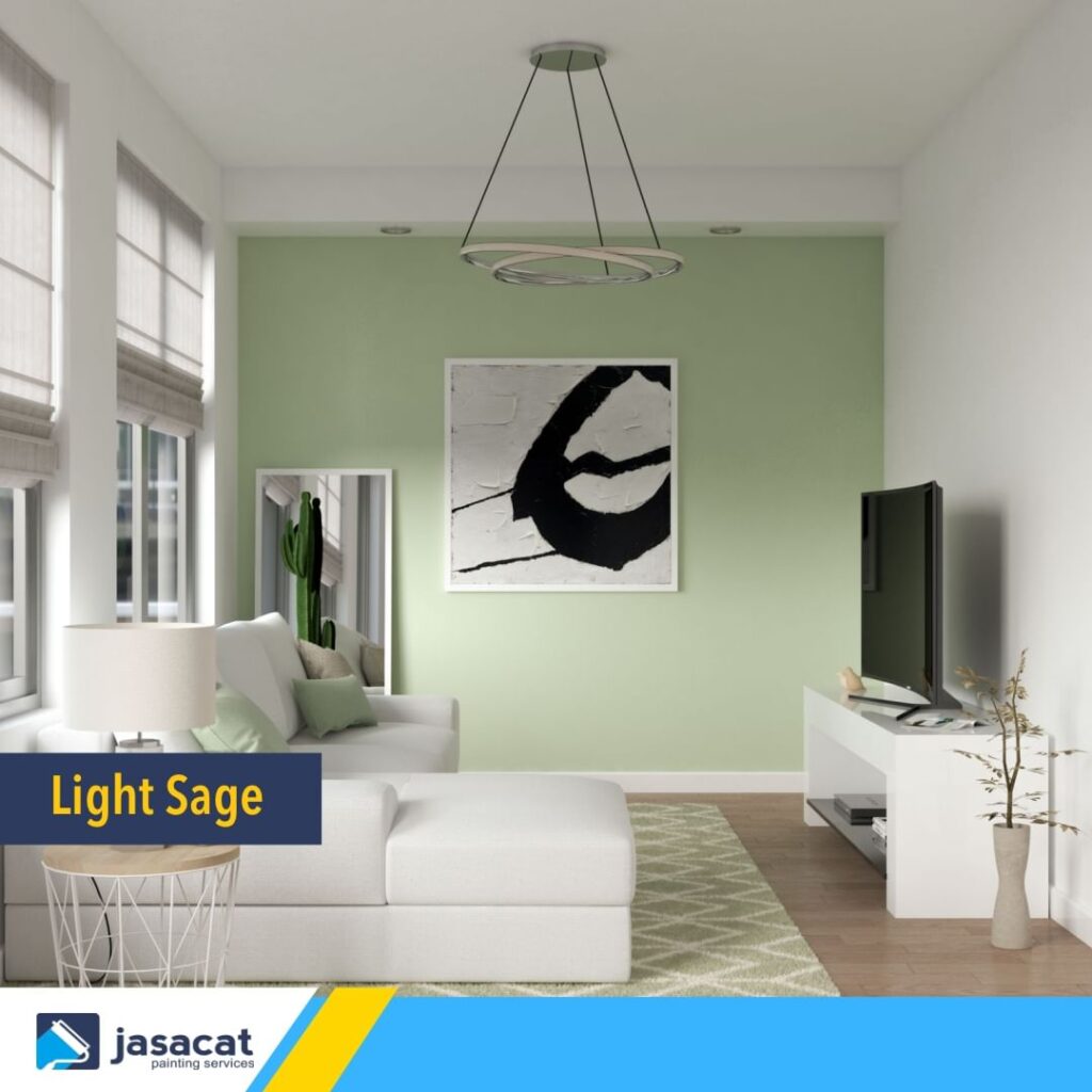 Light sage adalah warna hijau pucat yang menawarkan kesan alami dan sejuk. Warna ini cocok untuk menciptakan ruang yang nyaman dan damai. Anda dapat memilih light sage sebagai dinding aksen dan mengkombinasikannya dengan furnitur kayu atau aksesori alam untuk menciptakan tampilan yang seimbang.
