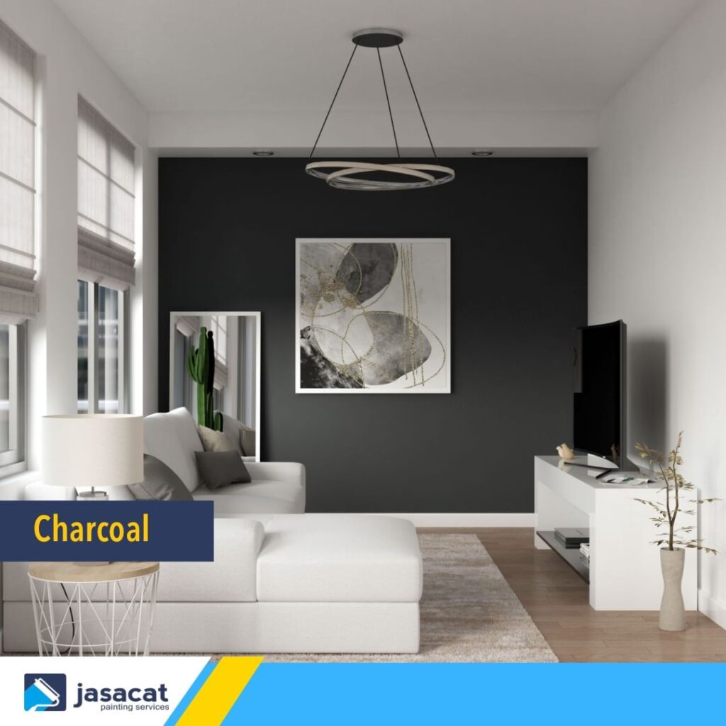 Charcoal adalah warna yang kuat dan dramatis. Jika Anda ingin menciptakan tampilan yang berbeda dan berani untuk ruang keluarga kecil Anda, charcoal bisa menjadi pilihan yang menarik. Gunakan charcoal sebagai dinding aksen dan padukan dengan aksesori berwarna cerah atau emas untuk efek yang mencolok.