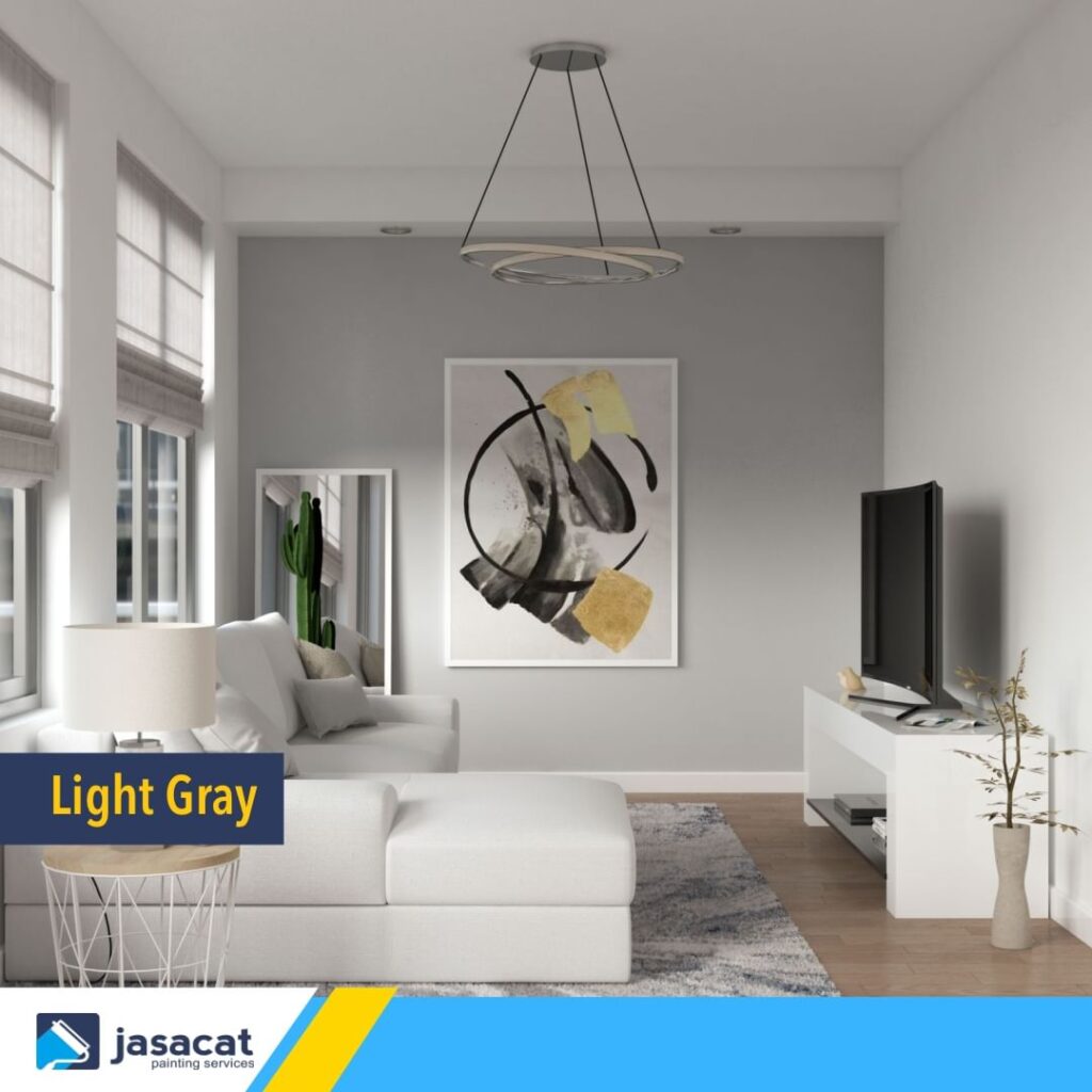 Warna light gray adalah pilihan yang sempurna untuk ruang keluarga kecil. Ini adalah warna netral yang bisa menciptakan kesan ruang yang lebih luas dan terang. Anda bisa menggunakan light gray sebagai dinding aksen dengan furnitur berwarna cerah atau aksen warna lainnya. Light gray juga cocok untuk menciptakan suasana yang tenang dan santai.