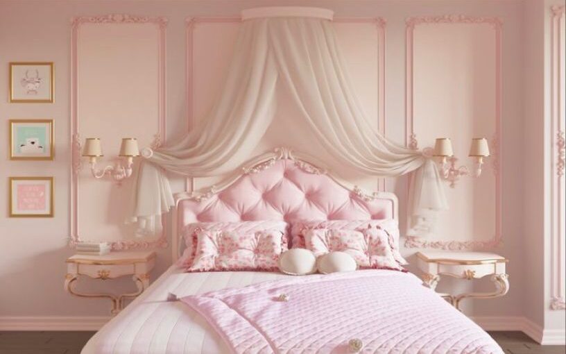 Anda bisa membuat dinding kamar berwarna pink. Tambahkan juga elemen-elemen mewah dan tirai kelambu yang sangat menawan. Selain itu, Anda juga bisa menambahkan chandelier atau lampu hias untuk menambah kesan seolah kamar putri kerajaan.