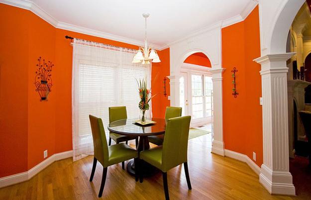Warna oranye adalah warna cerah yang dapat Anda gunakan untuk rumah modern. Warna ini terkesan ceria dan dapat menghidupkan suasana. Agar tidak terlalu mencolok, Anda dapat mengombinasikannya dengan warna netral seperti warna putih dan dengan desain interior berwarna netral lainnya agar lebih menarik.