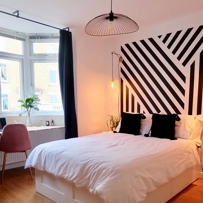 Selain menggunakan warna merah, Anda juga bisa menggunakan warna monokrom alias hitam putih untuk dijadikan cat dinding motif garis. Satu hal lainnya yang spesial di motif ini adalah penggunaan variasi antar vertikal, horizontal, maupun diagonal.