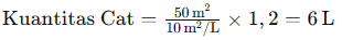 Misalkan Anda akan mengecat dinding ruang tamu dengan luas 50 meter persegi menggunakan cat interior yang memiliki daya tutup 10 meter persegi per liter dan faktor penyerapan 1,2. Maka: