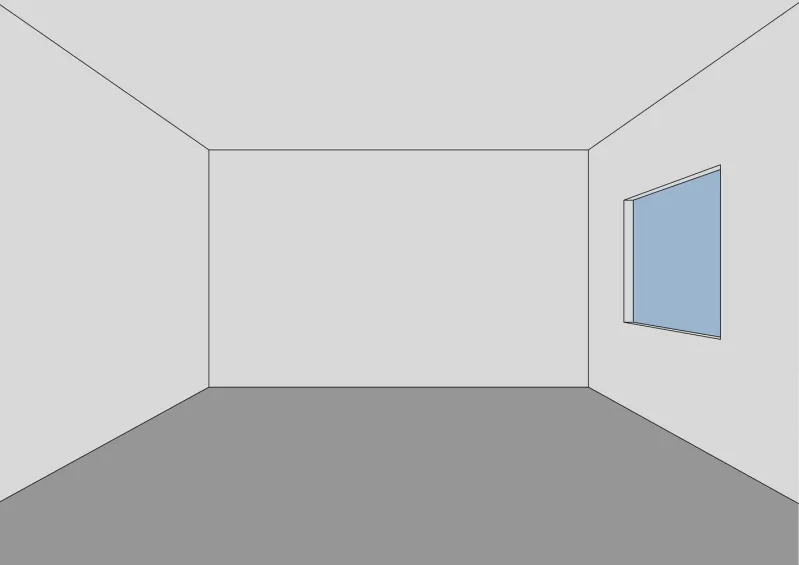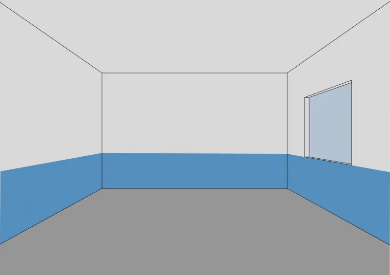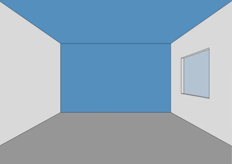 Pengecatan dinding belakang dan langit-langit dengan warna gelap yang sama dan membiarkan dinding samping lebih terang akan membuat ruang tampak lebih lebar dan lebih luas. Pewarnaan ini adalah teknik yang banyak digunakan di koridor atau ruangan sempit.