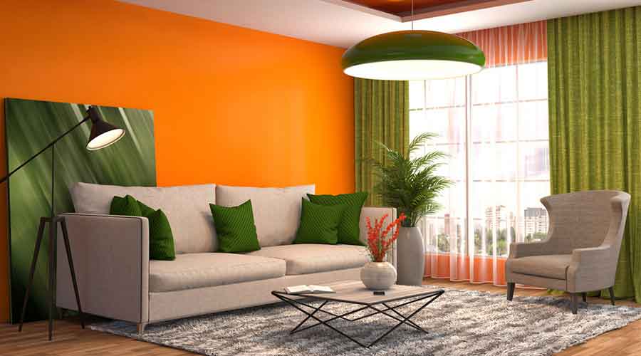 Warna oranye adalah simbol semangat dan kreativitas. Ini adalah pilihan yang fantastis untuk menciptakan ruang tamu yang berenergi dan penuh semangat.