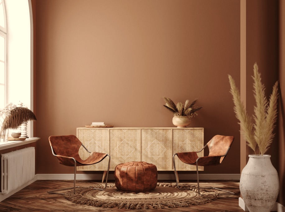 Terracotta adalah warna yang mengekspresikan kehangatan alam. Penggunaannya di dinding ruang tamu memberikan nuansa tanah yang menenangkan dan menghubungkan ruangan dengan alam.