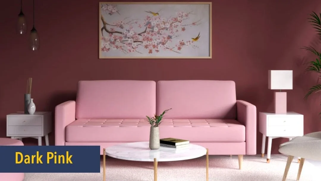 Jika Anda menginginkan tampilan yang berani dan monokromatik, dark pink pada dinding bisa menjadi pilihan yang menarik. Kombinasi antara sofa pink dengan dinding dark pink akan menciptakan ruangan yang berkesan kuat dan berani.