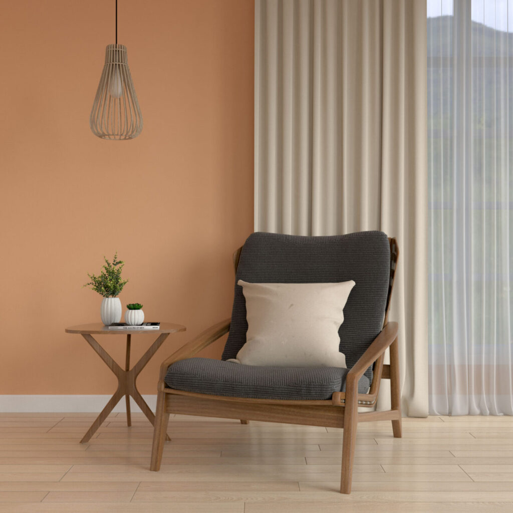 Warna orange muda menciptakan tampilan yang energetik. Ini adalah pilihan yang baik untuk menciptakan sentuhan keceriaan dalam ruangan dengan gorden beige.