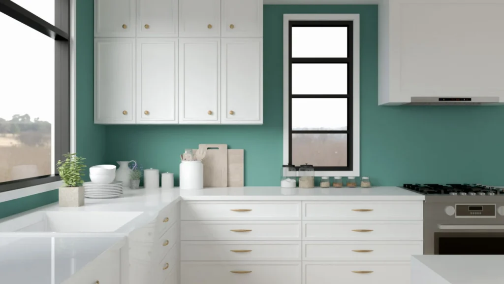 Teal adalah warna yang memberikan nuansa misterius dan segar pada ruangan. Kombinasinya dengan kabinet putih menciptakan dapur dengan sentuhan kontemporer dan keunikan yang menarik.