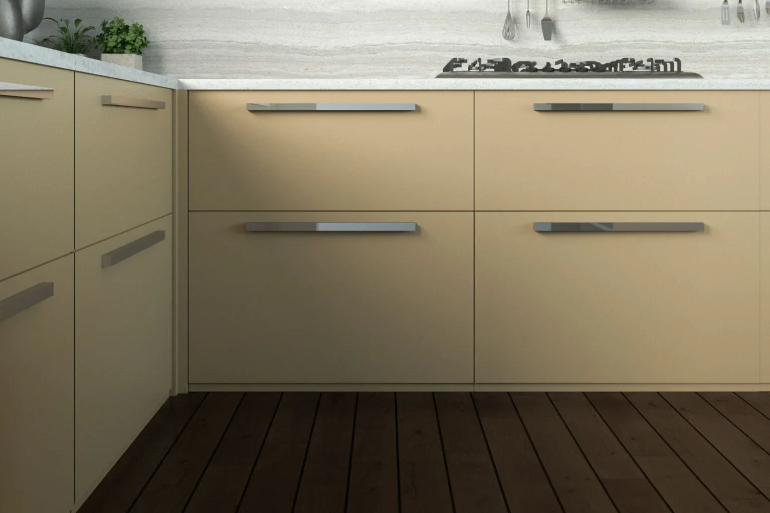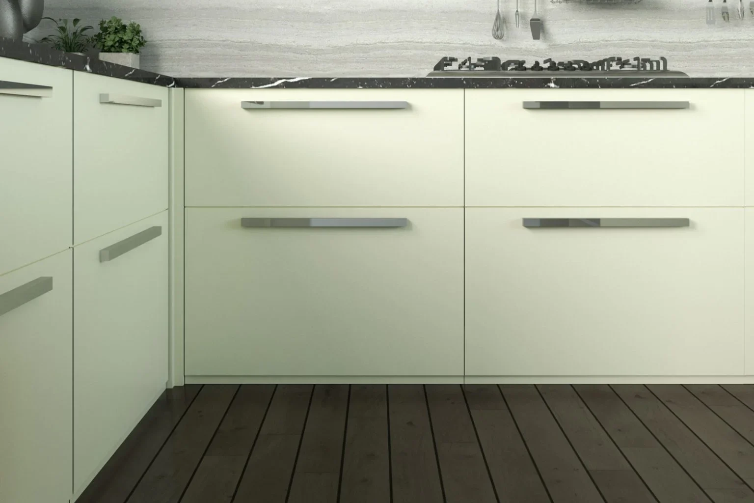Kuning muda adalah pilihan yang ceria dan menyegarkan untuk kabinet dapur Anda. Warna ini akan membawa cahaya dan keceriaan ke dalam ruang dapur Anda, menciptakan kontras yang menarik dengan lantai gelap.