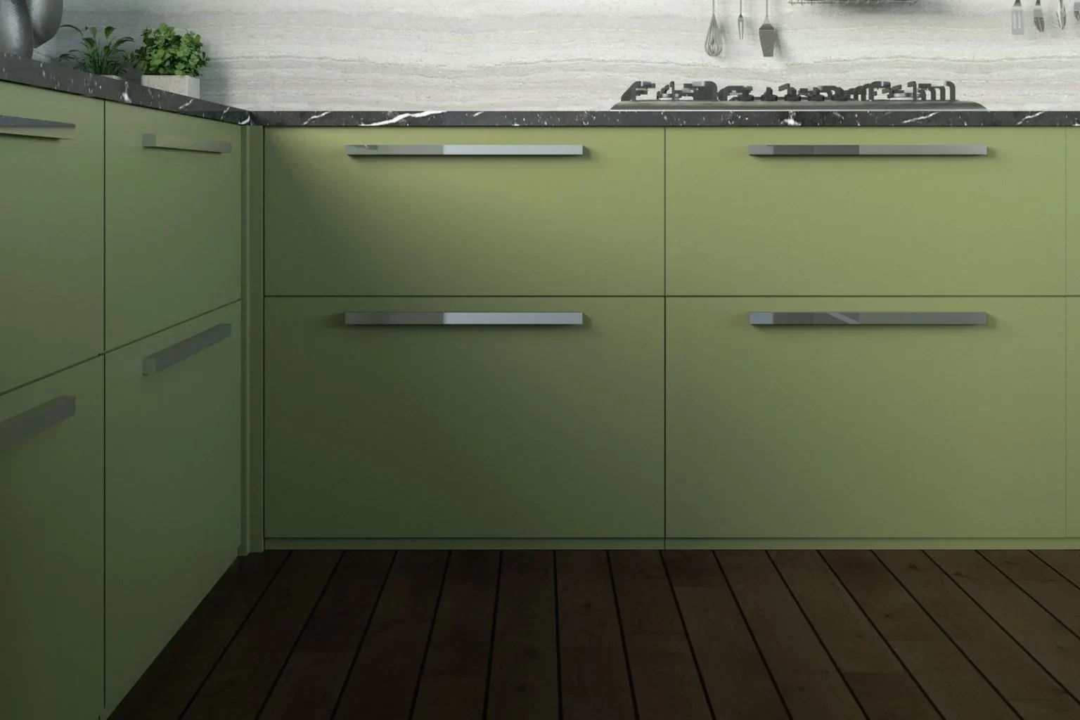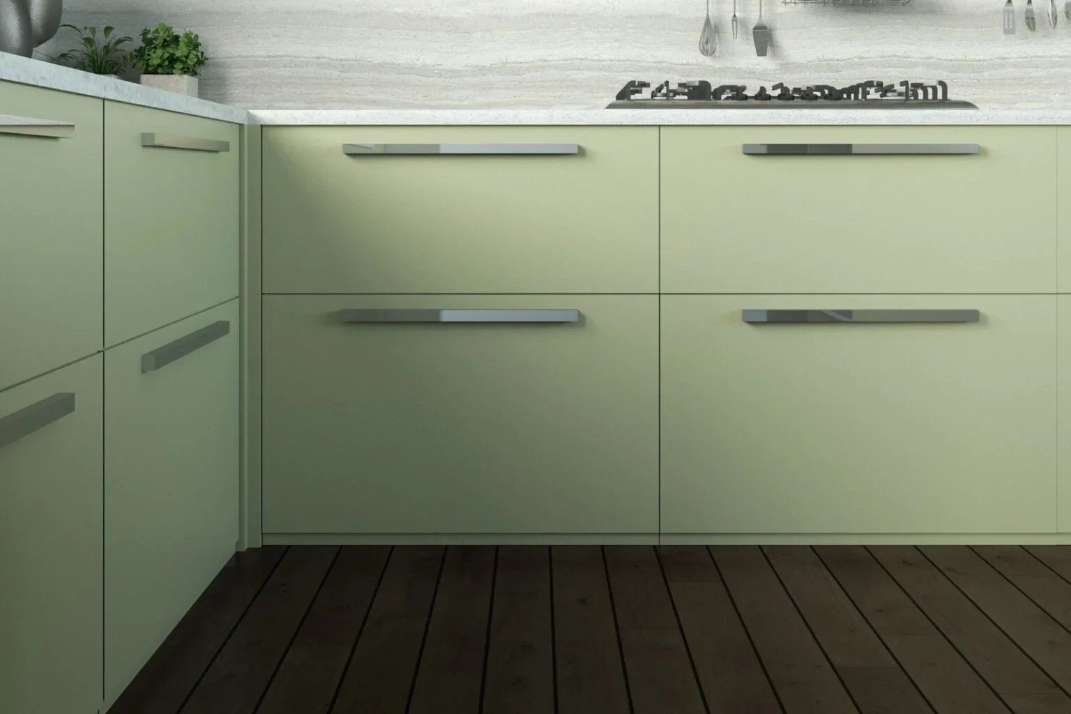 Sage adalah pilihan yang menenangkan dan alami untuk kabinet dapur Anda. Warna ini akan memberikan tampilan yang segar dan tenang pada ruang dapur Anda, sementara tetap menciptakan kontras yang menarik dengan lantai gelap.