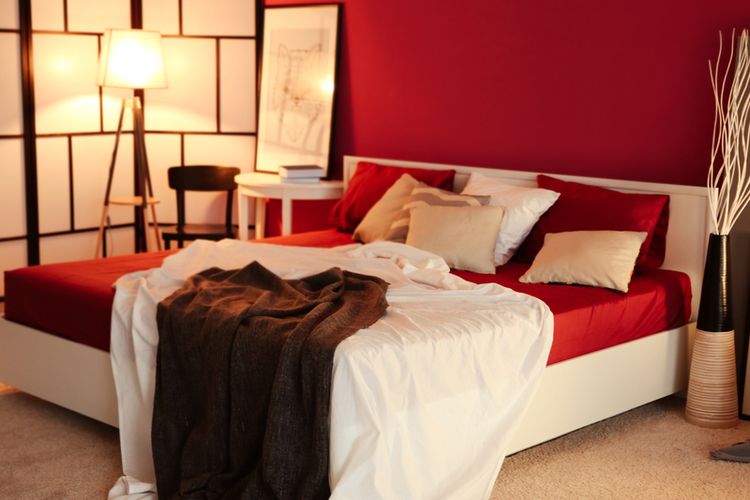 Jika Anda bingung ingin memberikan warna apa pada tempat tidur, cobalah menggunakan warna merah maroon dan krem agar ruangan terlihat lebih minimalis dan nyaman. Kedua warna ini mampu menghasilkan interior ruangan yang cantik, terlebih jika furniture yang Anda gunakan minimalis.
