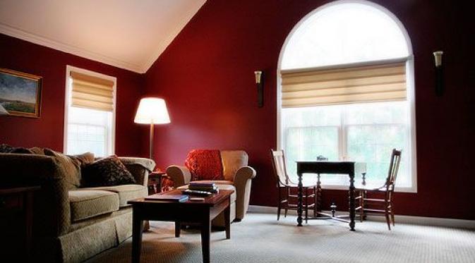 Berikan kesan menyenangkan pada ruang tamu dengan menggunakan kombinasi warna maroon dan cream untuk cat tembok. Sebagai tambahan, Anda juga bisa menggunakan furniture warna senada agar ruangan terasa lebih modern.