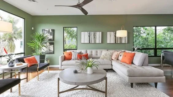 Hijau adalah warna yang asri dan menenangkan. Warna ini dapat menciptakan suasana alami dan segar dalam ruang tamu Anda. Pilih hijau muda untuk tampilan yang lebih ceria atau hijau daun untuk nuansa yang lebih mendalam. Kombinasikan dengan elemen dekorasi alami seperti tanaman hias untuk menciptakan kesan yang harmonis.