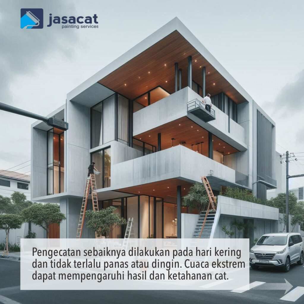 Cuaca ekstrem dapat mempengaruhi hasil dan ketahanan cat. Sebaiknya, pengecatan dilakukan pada hari yang kering dengan suhu yang tidak terlalu panas atau dingin. Kelembapan yang tinggi atau suhu yang sangat panas dapat menyebabkan cat tidak menempel dengan baik atau mengering terlalu cepat. Pilih waktu pengecatan yang sesuai, misalnya pada pagi atau sore hari ketika suhu lebih sejuk.