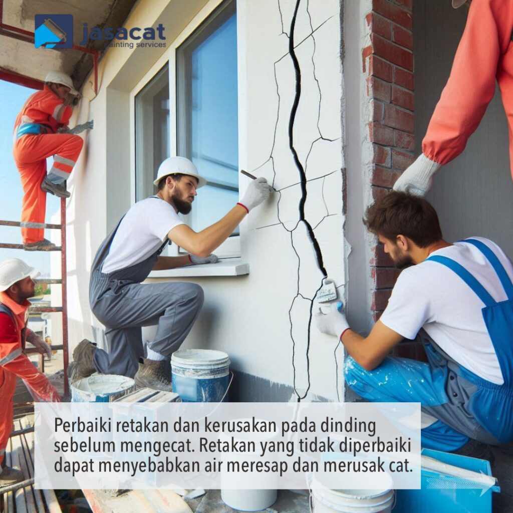 Sebelum mulai mengecat, periksa dinding untuk menemukan retakan atau kerusakan lainnya. Retakan yang tidak diperbaiki dapat menyebabkan air meresap dan merusak cat. Gunakan bahan pengisi retakan atau plester untuk memperbaiki kerusakan tersebut. Setelah itu, haluskan permukaannya agar cat dapat menempel dengan sempurna.