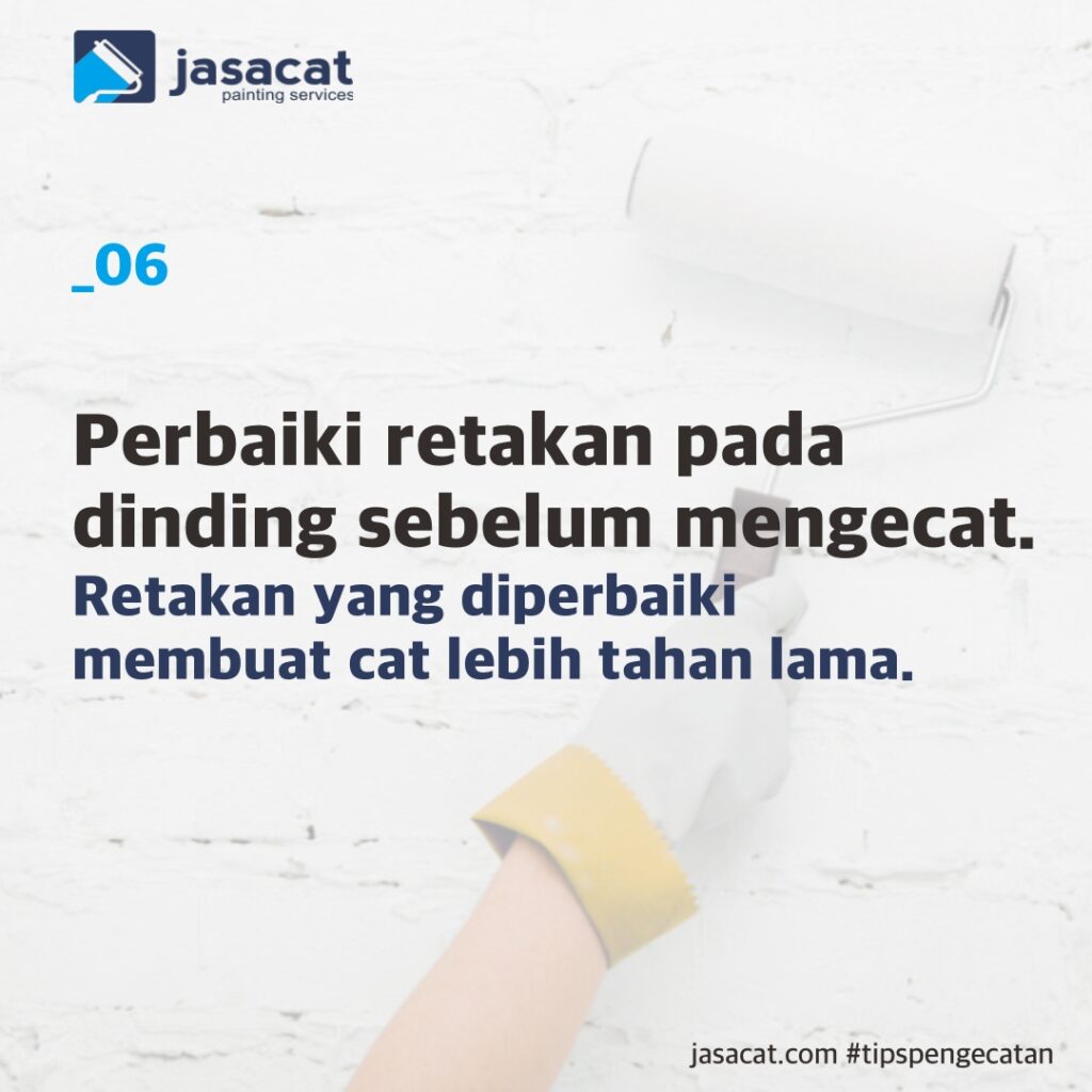 Perbaiki retakan dan kerusakan pada dinding sebelum mengecat. Retakan yang tidak diperbaiki dapat menyebabkan air meresap dan merusak cat. Gunakan plester atau filler untuk menutup retakan, dan amplas permukaan hingga halus sebelum mulai mengecat.