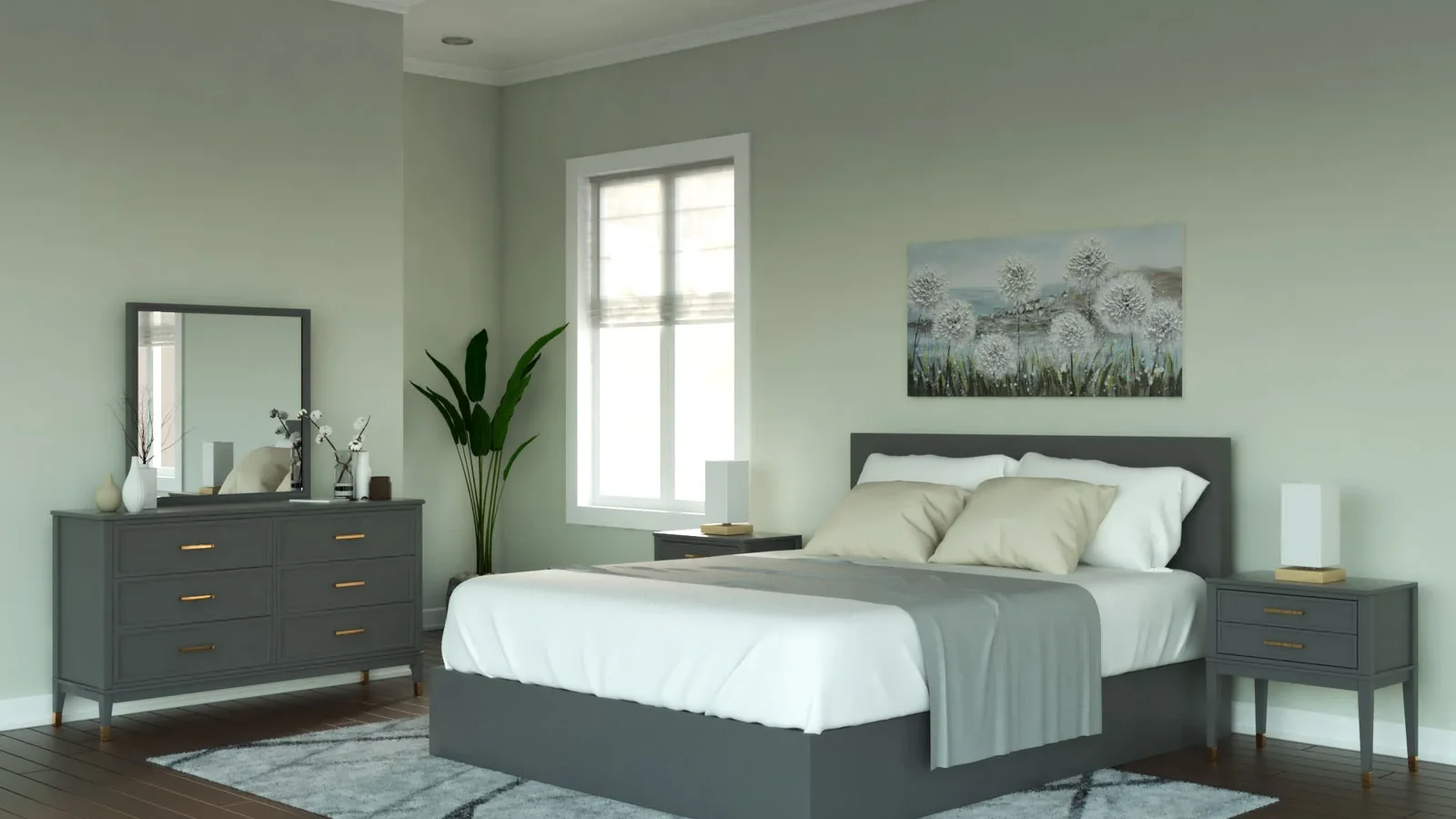 Jika Anda ingin warna abu-abu yang tidak terlalu gelap tetapi tetap memberikan kesan mewah, Pearl Gray adalah pilihan yang tepat. Warna ini memberikan nuansa modern sekaligus hangat, sehingga cocok digunakan sebagai warna dinding bergaya untuk furnitur kamar tidur abu-abu. Pearl Gray menambah dimensi pada kamar tidur dan membuat furnitur abu-abu Anda lebih menonjol tanpa kehilangan kesan lembut.