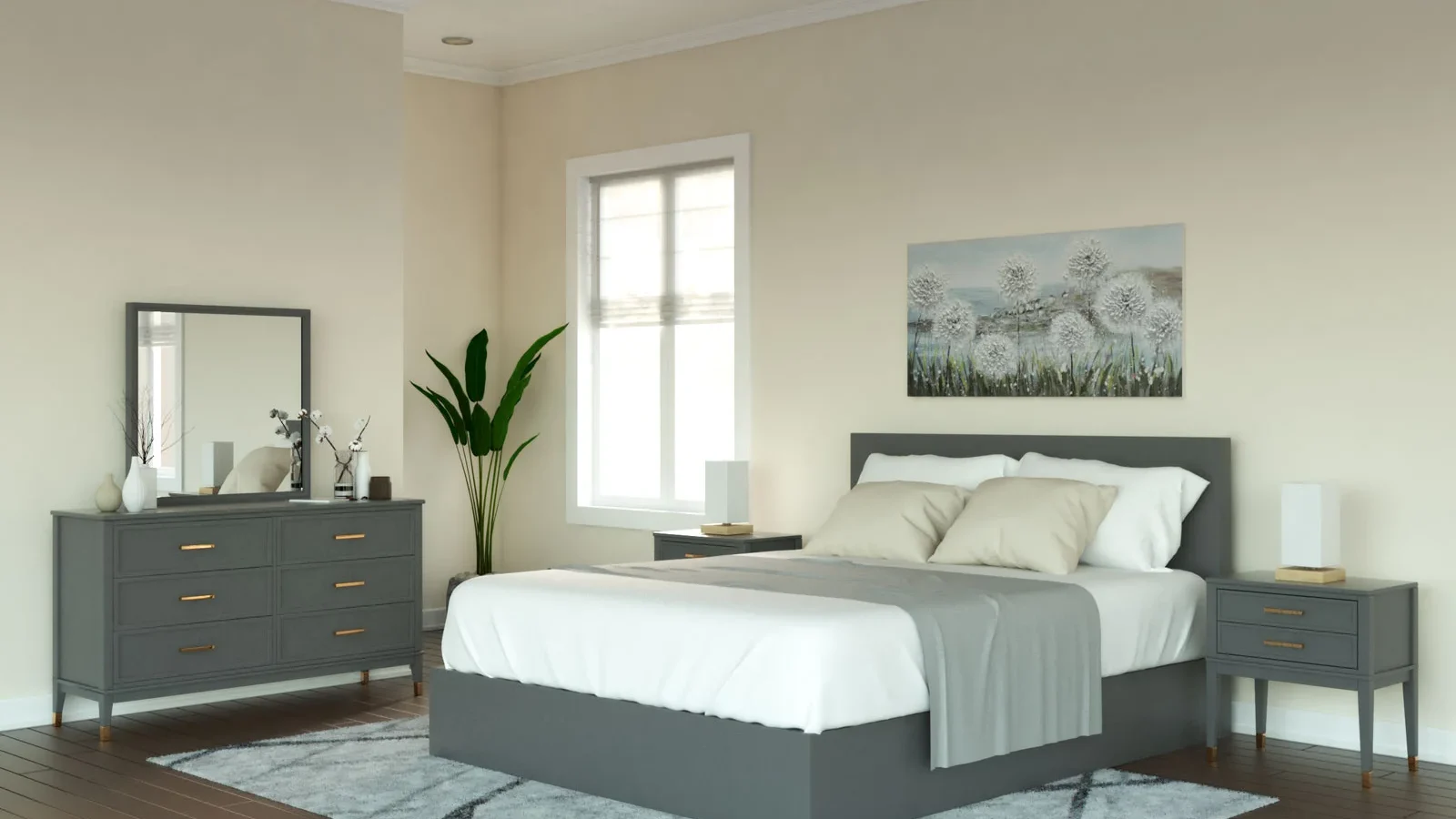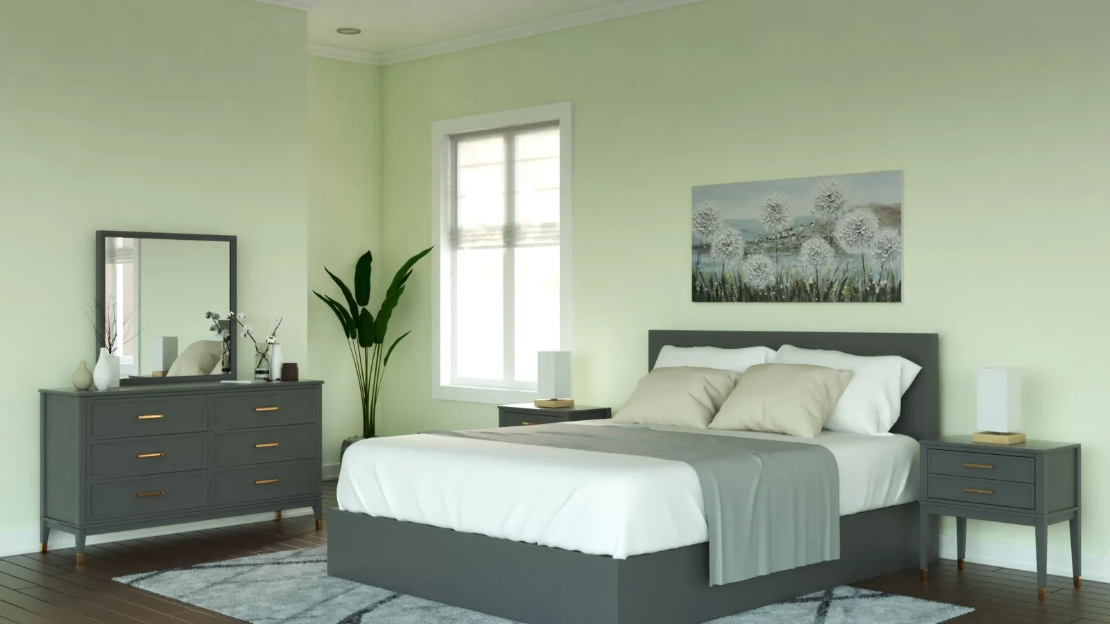 Lighter gray atau abu-abu muda merupakan warna dinding yang tepat jika Anda ingin menciptakan kesan selaras dengan furnitur abu-abu Anda. Dengan menggunakan warna dinding bergaya untuk furnitur kamar tidur abu-abu ini, nuansa kamar akan terlihat harmonis dan tidak mencolok. Kombinasi abu-abu muda dan abu-abu gelap dari furnitur akan memberikan kesan elegan yang hangat dan mengundang. Cocok untuk Anda yang menyukai estetika minimalis dengan nuansa monokrom yang menenangkan.