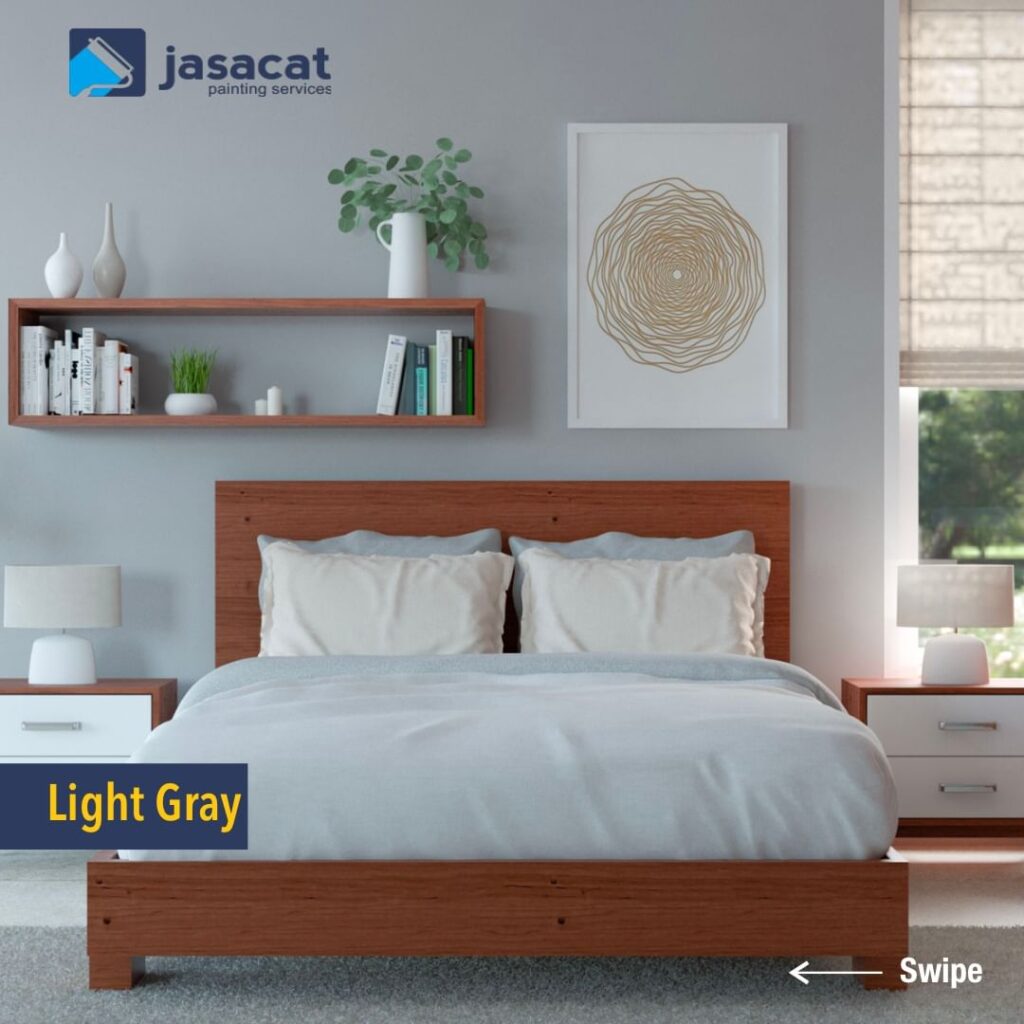 Light grey memberikan nuansa modern dan elegan pada kamar tidur. Cocok digunakan untuk menciptakan tampilan yang tenang dan rileks. Kombinasi dengan furniture cokelat memberikan kontrast yang subtil dan menarik.