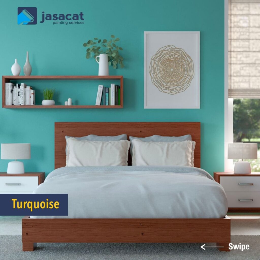 Turquoise adalah warna yang segar dan energik. Digunakan sebagai warna dinding kamar tidur, menciptakan tampilan yang cerah dan menyenangkan. Kombinasi dengan furniture cokelat memberikan kontrast yang menarik dan penuh gaya.