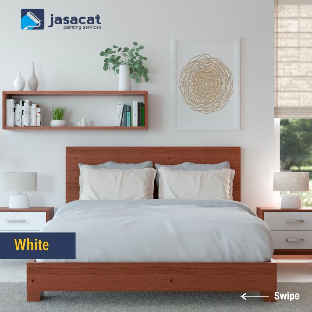 White adalah pilihan yang timeless dan serbaguna. Ketika digunakan sebagai warna dinding kamar tidur untuk furniture cokelat, white menciptakan kontrast yang menonjolkan kehangatan dan keindahan furniture tersebut. Ruangan terasa lebih terang, bersih, dan terorganisir.