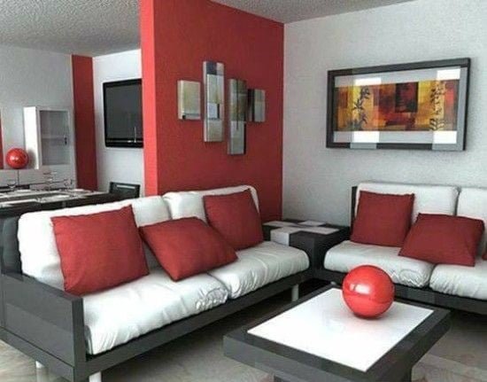 Warna grey sebagai dasar memberikan kesan yang tenang dan netral, sehingga memberikan kesempatan bagi warna merah untuk menjadi sorotan utama pada desain rumah. Warna merah yang dipadukan dengan grey memberikan kesan yang energik, berani dan dinamis.