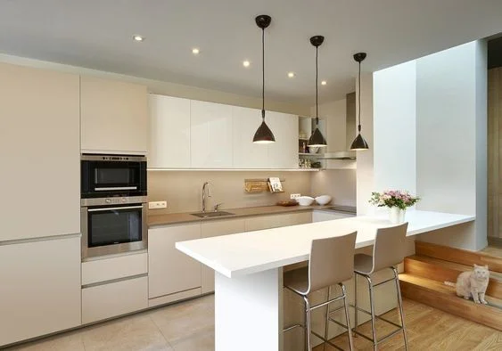 Warna krim memberikan sentuhan hangat dan elegan pada dinding dapur, menciptakan suasana yang ramah dan menyenangkan. Kombinasi dengan furnitur putih akan memberikan kontras yang menarik dan tetap menciptakan kesan bersih.